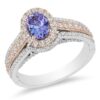 Drenched with vibrant colour, this gemstone and diamond engagement ring is an unforgettable look. Crafted in 14K two-toned gold, this bold design showcases a delectable 7.0 x 5.0mm oval-cut violet-blue tanzanite set in rose gold and wrapped in a sparkling diamond frame. A diamond-encrusted rose and white gold multi-row wrap-around the rose gold shell and white gold and diamond ribbons underneath. Small crown insets lower on the complete this magical choice. Sublime with 3/4 ct. t.w. of diamonds and a brilliant buffed luster, this engagement ring is a unique look of love.